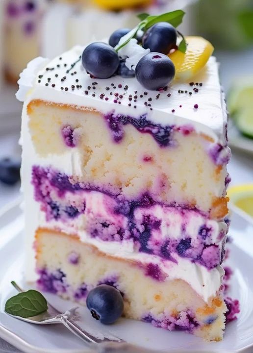 Warstwy ciasta cytrynowo-jagodowego są tak wilgotne i miękkie. To delikatne ciasto maślane odświeżone odrobiną świeżego soku z cytryny i skórki cytrynowej, nakrapiane soczystymi jagodami. Jest słodkie i cierpkie, idealne na deser wiosenny i letni.