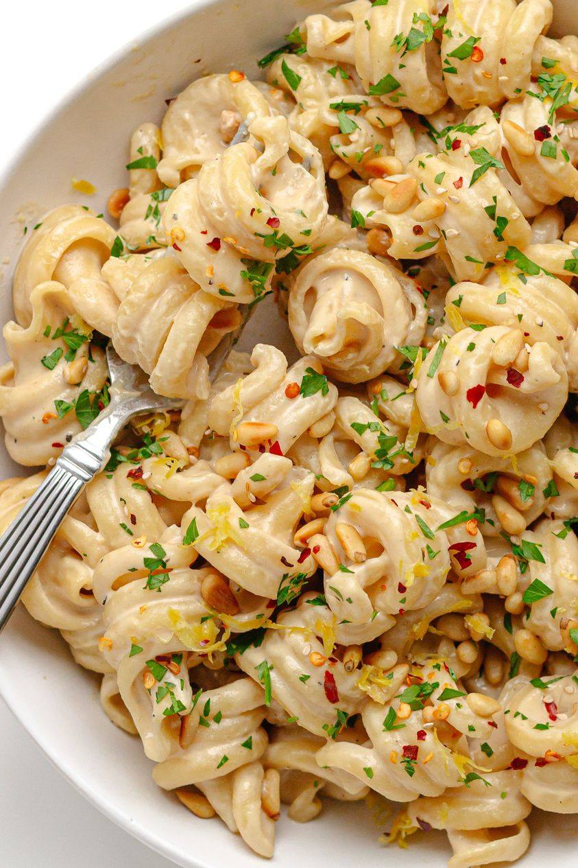 Udekoruj: posiekaną świeżą pietruszką lub bazylią, płatki czerwonej papryki lub chili, prażone nasiona sezamu lub orzeszki piniowe, skórka cytryny itp.