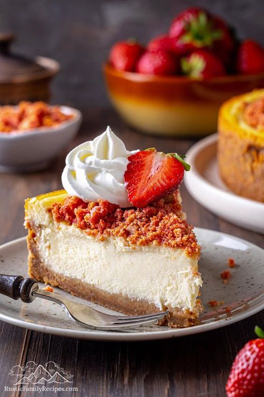 Dziesięć Instant Pot Crispy Cheesecake z Strawberries ma warstwę kremowego sernika, zapieczonego na cieście z wafla Nilla i posypanego kruszonką z truskawkowego ciasta!