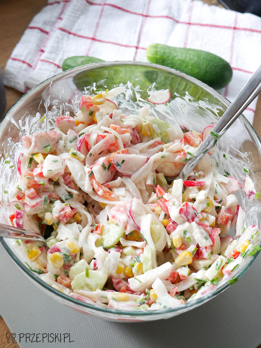 Przepis na sałatkę z makaronem ryżowym nie jest trudny i nie wymaga skomplikowanych składników. Oprócz makaronu ryżowego w sałatce znajdziemy również takie składniki jak; paluszki krabowe, paprykę, ogórka, kukurydzę, rzodkiewkę i szczypiorek. Całość polana sosem na bazie jogurtu i majonezu.