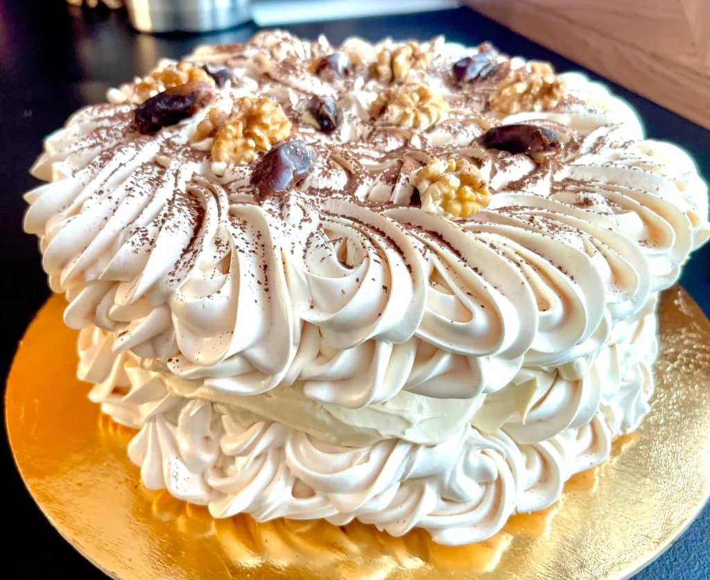 Dziś coś dla miłośników słodkich i chrupiących deserów. Torcik bezowy przekładamy kremem kajmakowym z orzechami i daktylami. Przepyszny!